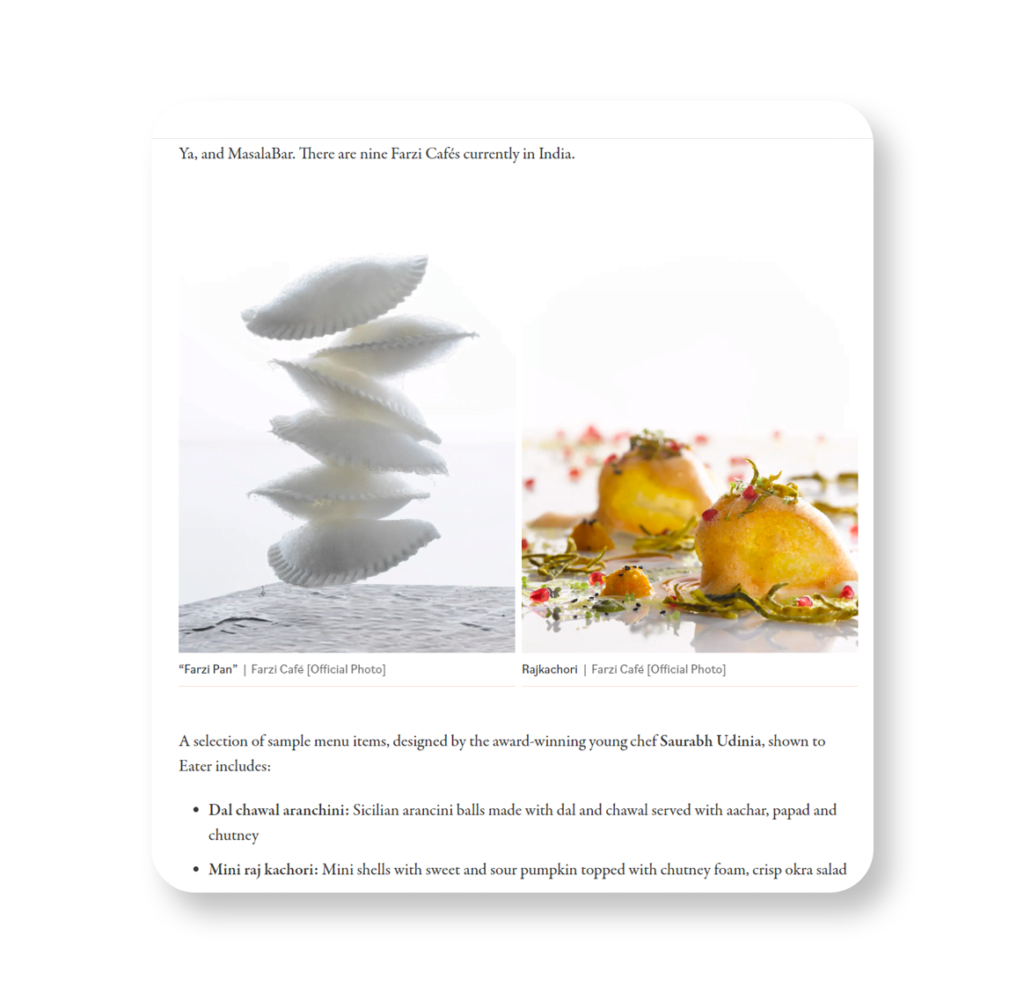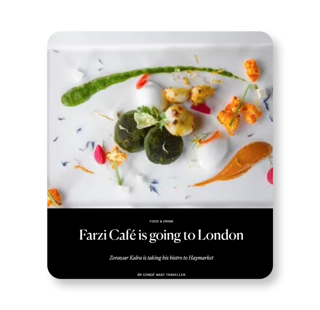 Farzi Café Focusing on the gourmet diner as well as the youth of India, Farzi Café aims to bring Indian cuisine back “in-Vogue”. “Farzi” can have many connotations, but at Farzi Café, it has just one, “creating an illusion” with its cuisine. Best described as a gourmet experience, it amalgamates traditional global and Indian classics, with Indian influences, contemporary presentations, culinary styles and ambiance. It is a quirky, chic, modern Indian café, where guests enjoy a sensory experience through the finest modern Indian cuisine, with a high energy ambiance. Infusing a generous dose of Indian flavours, Farzi Café presents Indian cuisine where culinary art meets the alchemy of modern presentations and cooking techniques like molecular gastronomy to absorb the guest into the ultimate gastronomic illusion.